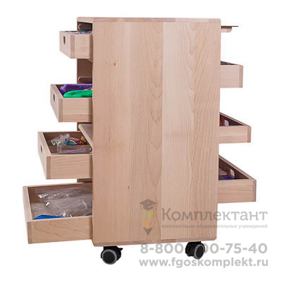 Мобильный стеллаж для хранения модулей изготовлен из натурального дерева (бука) и сконструирован в соответствии с педагогико-эргономическими требованиями, обеспечивает быстрый доступ к дидактическому материалу, простоту обзора и подбора необходимого для занятий материала.