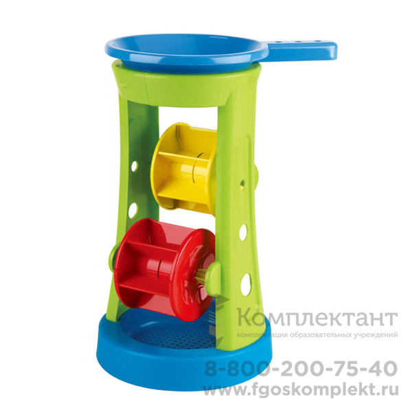 Налейте воду, засыпьте песок или мелкие камни в воронку и посмотрите как вращаются колеса!