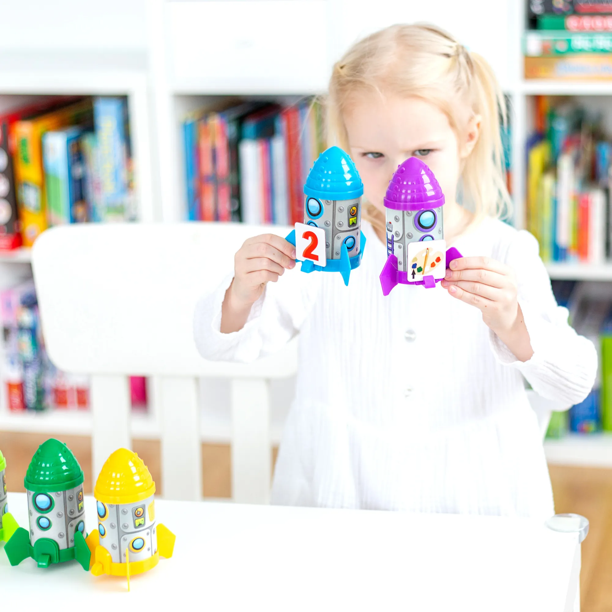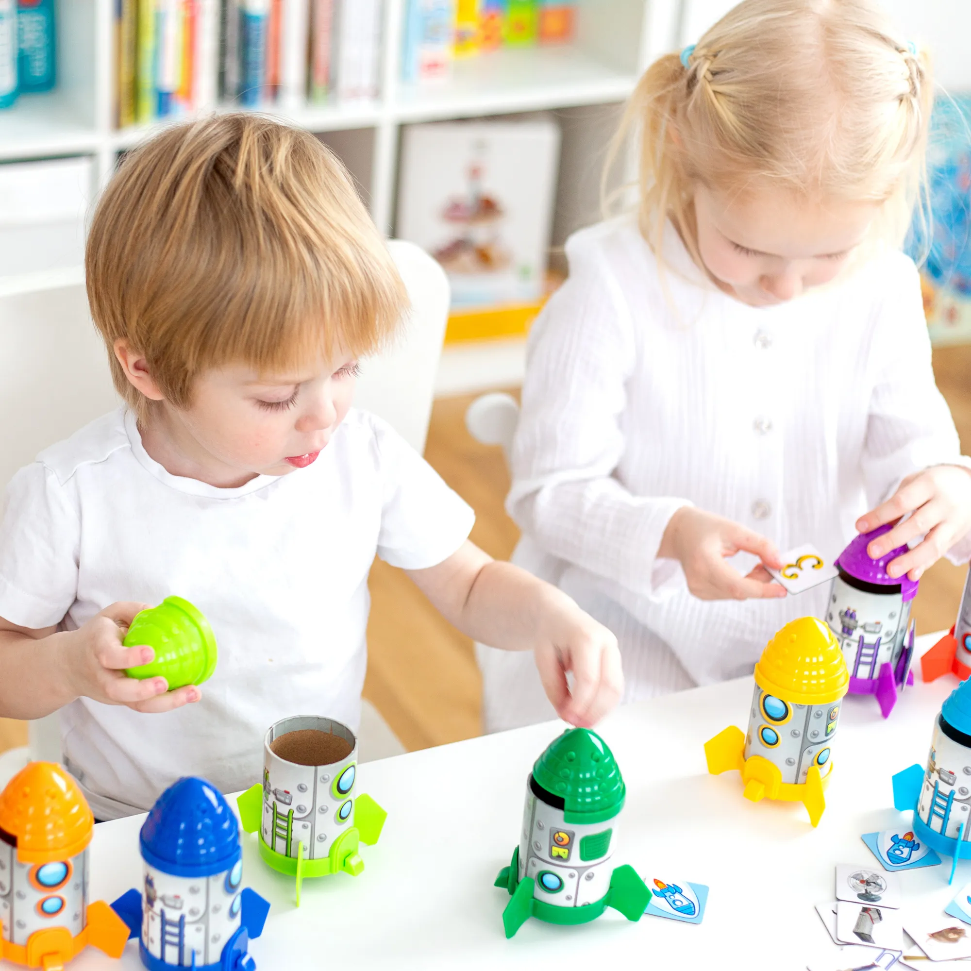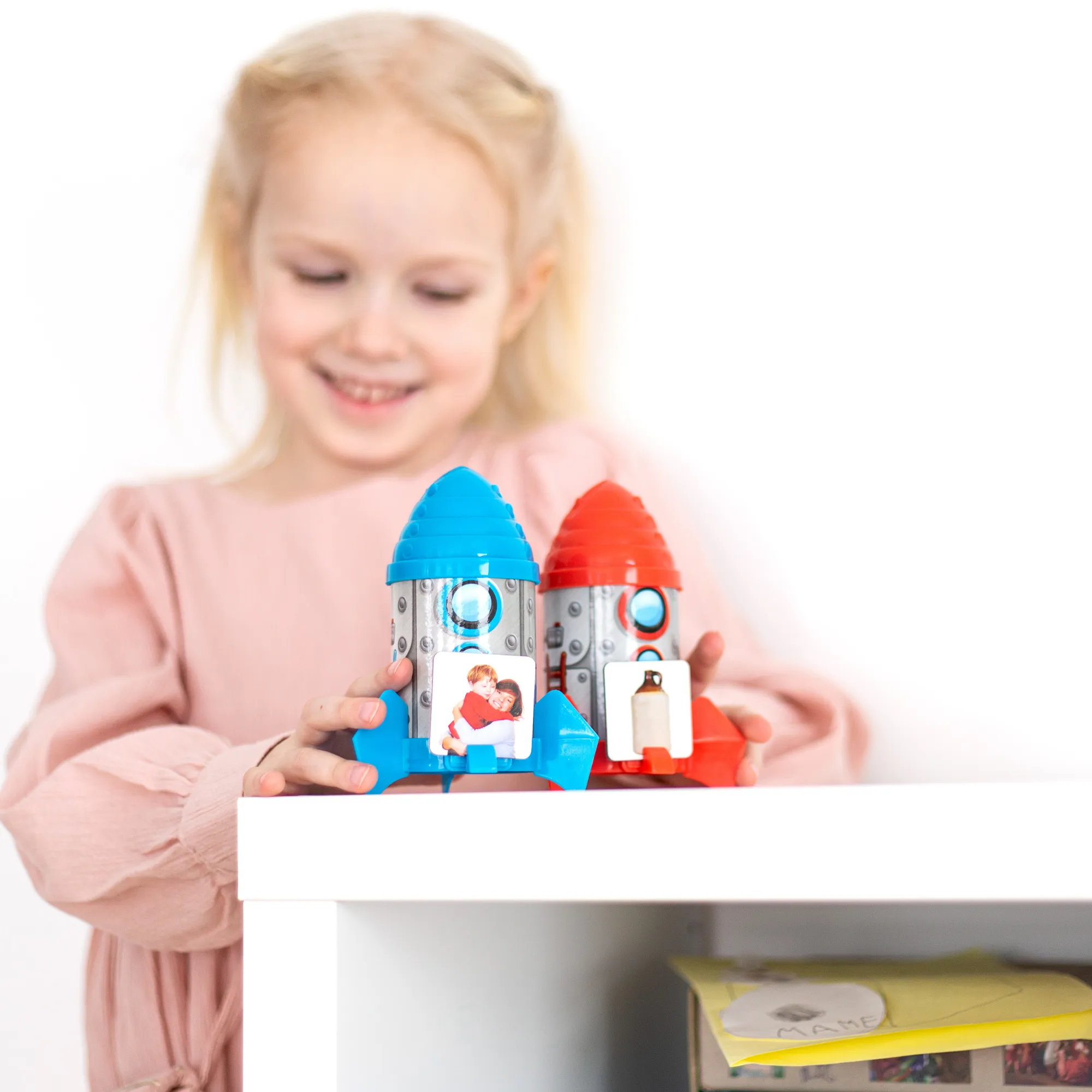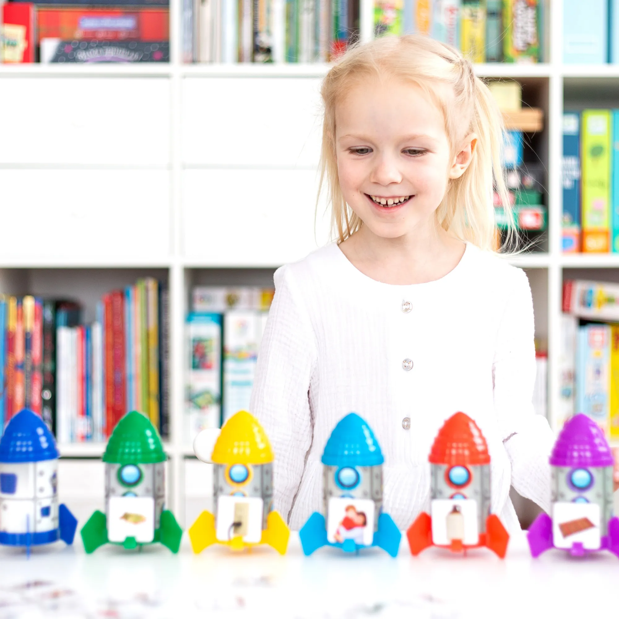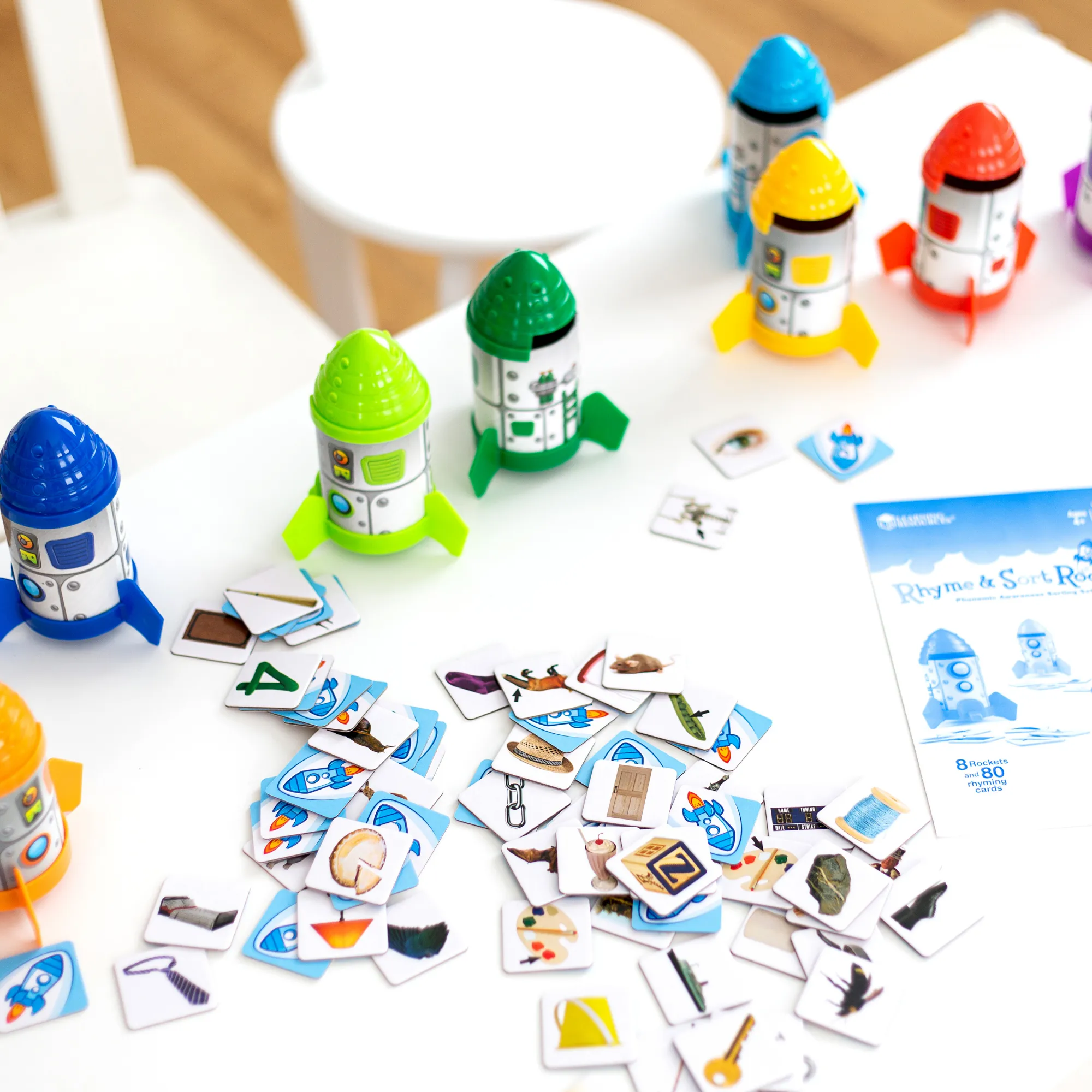 Набор позволяет детям изучать английские слова, звуки английского алфавита, слоги и многое другое, способствует развитию речи и пополнению словарного запаса. Разработанный для изучения рифм, укрепления фонематического слуха, пополнения словарного запаса, изучения слогов и многого другого, набор включает в себя удобные для детей космические корабли и фотокарточки с реальными изображениями, чтобы помочь ученикам в изучении английского языка. Выведите их на орбиту с помощью следующих предложенных заданий, и вскоре вы объявите: «Миссия выполнена!».