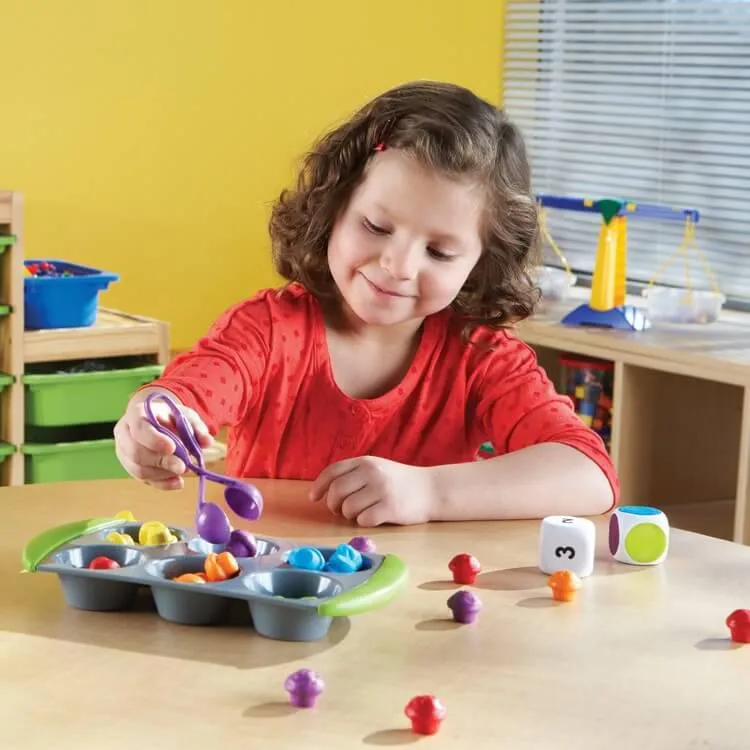 Ребенок учится брать маффины с помощью маленьких щипчиков-ложек, тем самым тренируя мелкую моторику.