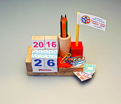 Игровой набор представляет собой настольный календарь с наклейками, которым можно пользоваться в течение нескольких лет. Наклейки приклеиваются детьми. С помощью набора дети в игровой форме знакомятся с календарем, а также некоторыми свойствами объемных фигур, позволяющих создать такой календарь. Календарь подходит для организации сюжетно-ролевых игр.