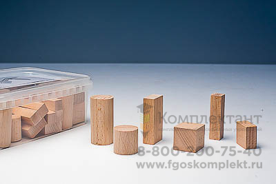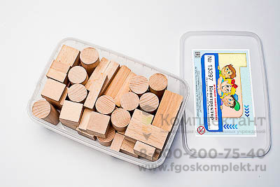 Комплектность: кубики (25*25*25 мм) – 12 шт., цилиндры большие (диаметр 25 мм, высота 50 мм) – 6 шт., цилиндры малые (диаметр 25 мм, высота 25 мм) – 8 шт., параллелепипеды-кирпичики (50*25*12,5 мм) – 8 шт., параллелепипеды-столбики (50*12,5*12,5 мм) – 8 шт., параллелепипеды-полукирпичики (25*25*12,5 мм) – 8 шт., карточки – 4 шт., руководство по эксплуатации – 1 шт.