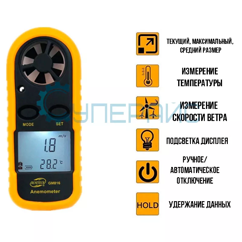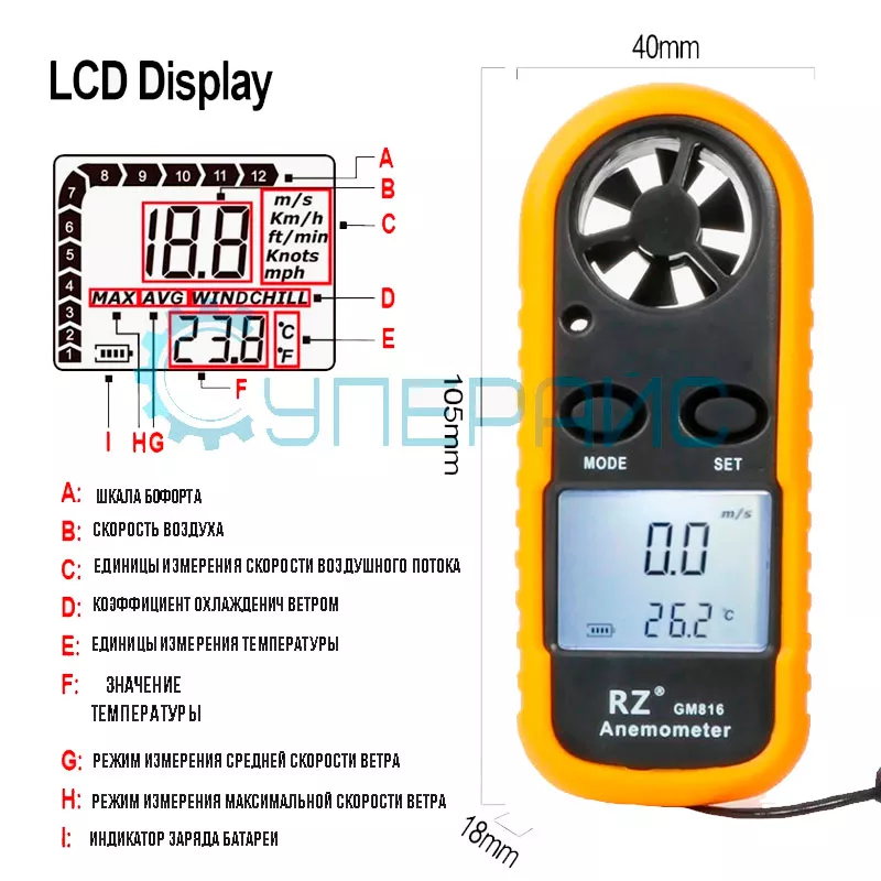 Функциональные возможности измерение скорости ветра (мгновенной, максимальной, средней),