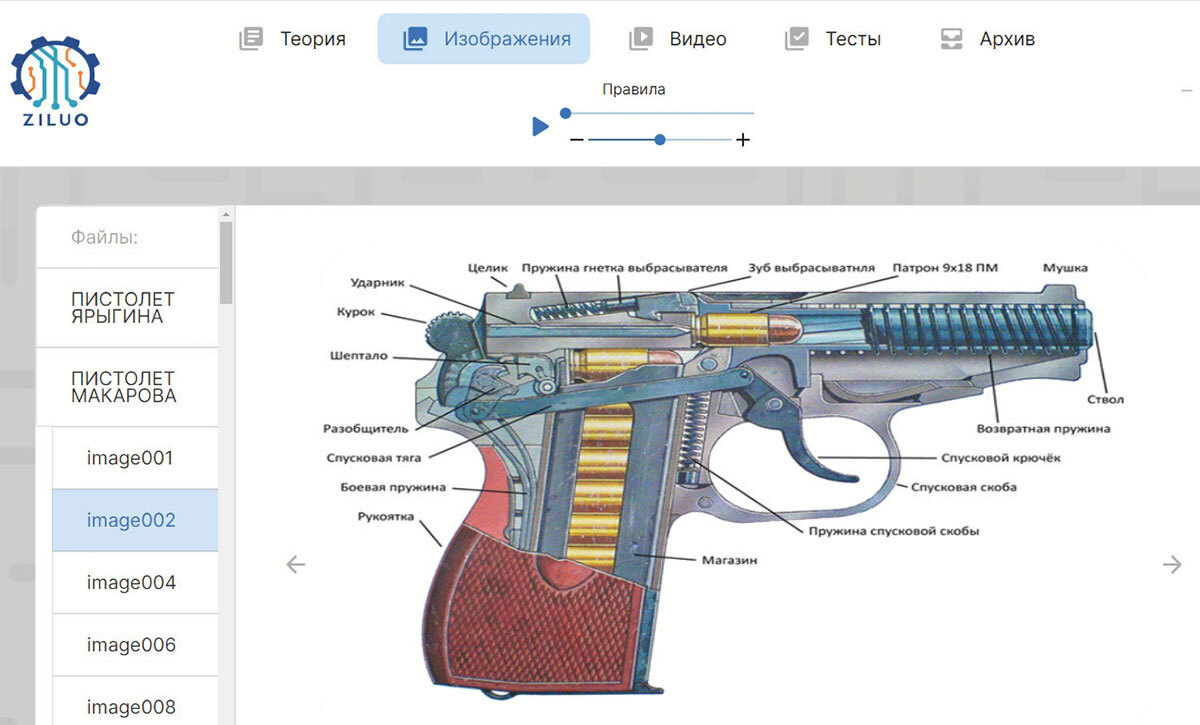 В состав комплекса также входит интерактивное программное обеспечение, позволяющее организовать теоретический курс для изучения «Техники безопасности при проведении учебных занятий и правилами эксплуатации огнестрельного оружия».